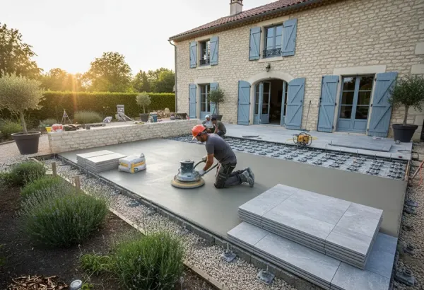 Pour une terrasse en pierre ou en céramique, une dalle béton ou une chape adaptée assure la stabilité et la durabilité de l’ouvrage. Les pentes doivent être soigneusement calculées afin de garantir l’évacuation des eaux pluviales et éviter toute stagnation.